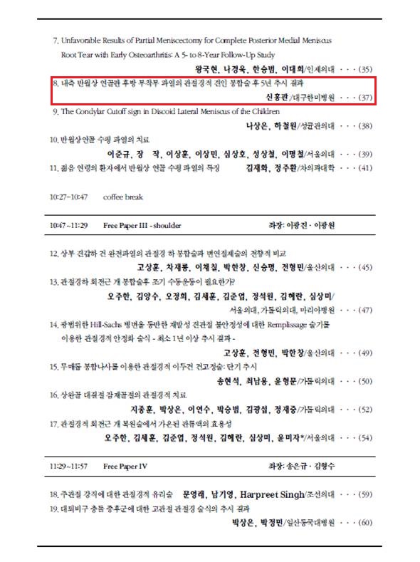 2010.10.14[대한정형외과학회 발표] 내측 반월상 연골판 후방 부착부 파열의 관절경적 견인 봉합술 후 5년 추시 결